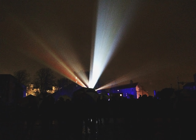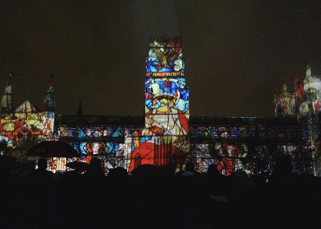 Snatches from the weekend: walking round the streets and along the river in the dark - rain hammering down, seeping through my hat into my hair - but not feeling afraid. My heart in my throat. Moving images – stars, numbers, planets, stained glass figures – sliding up and down and along the sides of the cathedral. Standing on the grass, mud underfoot, eyes wide, and music surrounding us: so loud and drumming and achingly beautiful that I could feel it inside my veins.